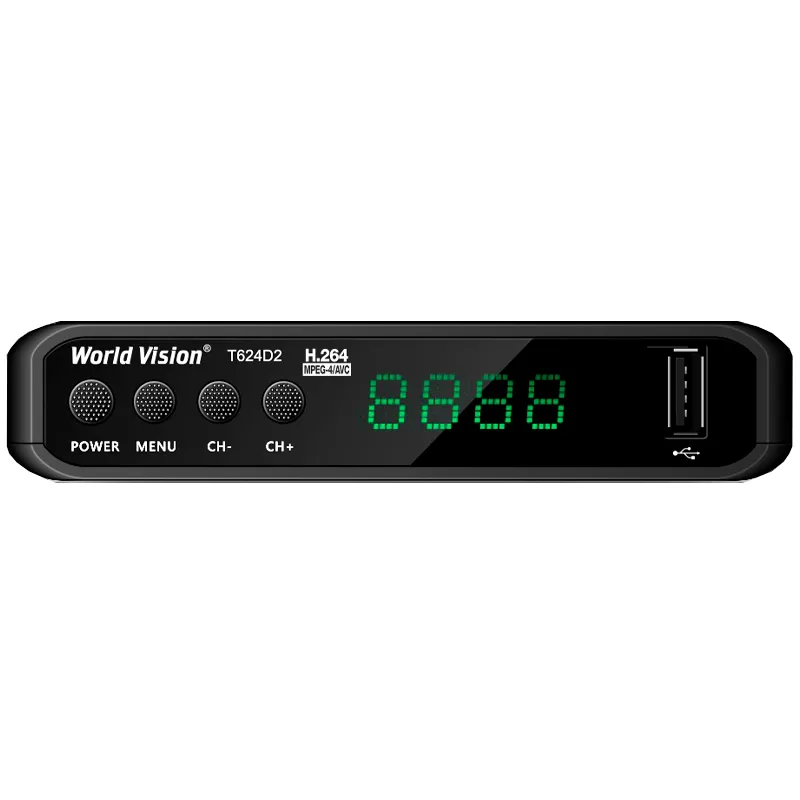 Отличие World Vision T624 D2 перед другими ТВ приставками нового модельного ряда построенного на процессоре GUOXIN GX6701, это наличие светодиодного LED дисплея и кнопок управления на лицевой панели корпуса, а питание приёмника организовано от встроенного блок питания.